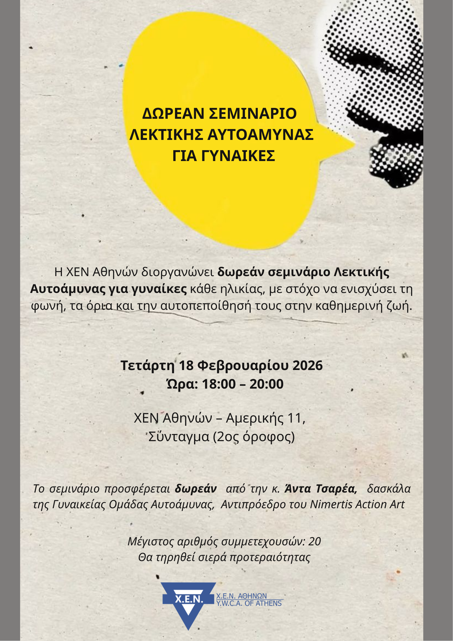 Η ΧΕΝ Αθηνών διοργανώνει δωρεάν σεμινάριο Λεκτικής Αυτοάμυνας για γυναίκες κάθε ηλικίας, με στόχο την ενδυνάμωση και την αυτοπεποίθηση.