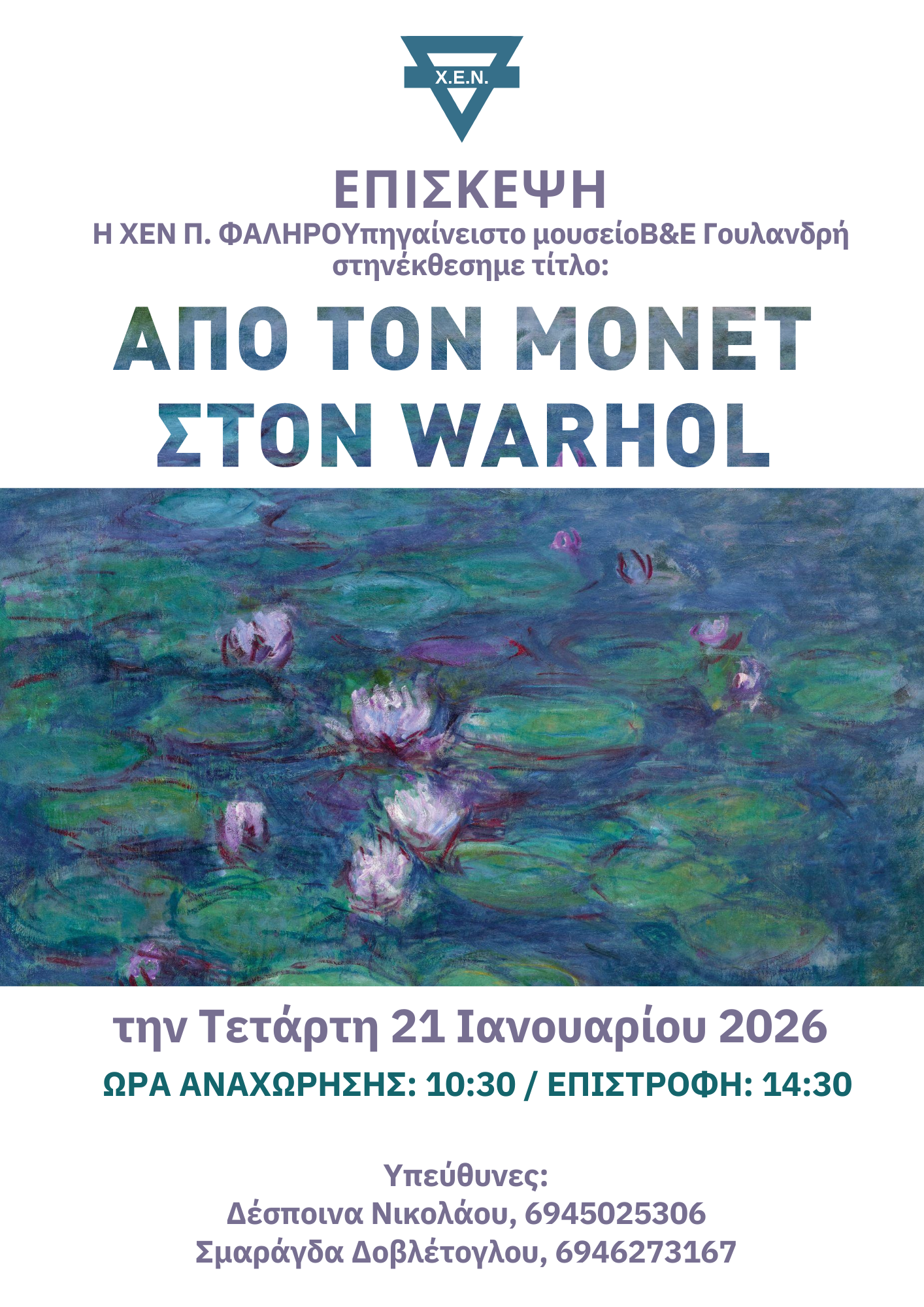 Επίσκεψη στην έκθεση «Από τον Monet στον Warhol» 21 Ιανουαρίου 2026 - 10:30 Ίδρυμα Βασίλη & Ελίζας Γουλανδρή ◄ Προηγούμενη Ανάρτηση Επόμενη Ανάρτηση ► Αίτηση Συμμετοχής στην Εκδήλωση : Επίσκεψη στην έκθεση «Από τον Monet στον Warhol» Όνομα * E-Mail * Διεύθυνση Κατοικίας Επώνυμο * Τηλέφωνα * Επάγγελμα Πρόσθετες Πληροφορίες Εγγραφή στο ενημερωτικό δελτίο της ΧΕΝ Αθηνών Τα στοιχεία που μας παραχωρείτε αποτελούν προσωπικά δεδομένα και τα διαχειριζόμαστε σύμφωνα με τις διατάξεις του Γενικού Κανονισμού Προστασίας Δεδομένων Προσωπικού Χαρακτήρα (GDPR, EE 2016/679) και του Ν.2472/1997 όπως έχει τροποποιηθεί από το Ν.3471/2006 και ισχύει σήμερα. Συνεπώς, δεν πρόκειται να αποκαλυφθούν σε τρίτους ή να χρησιμοποιηθούν για άλλο σκοπό, πέρα από την επικοινωνία και την ενημέρωσή σας σχετικά με τις δράσεις της Χ.Ε.Ν Αθηνών. Αποστολή