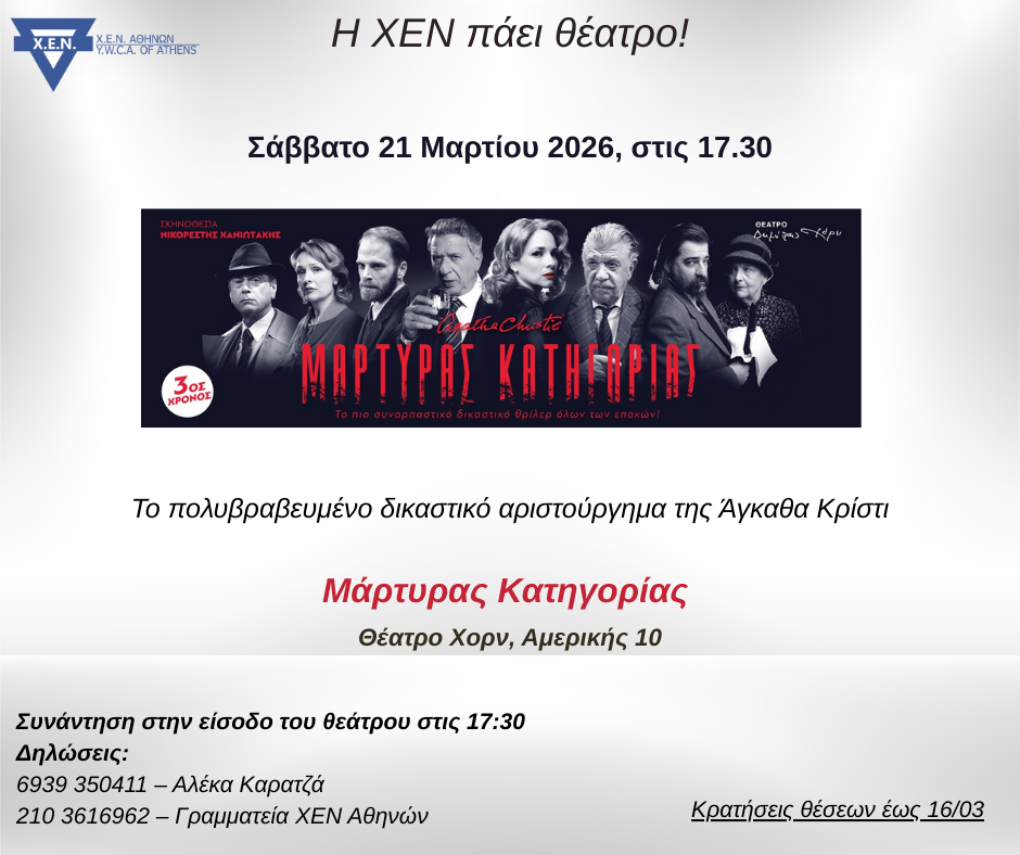 Η ΧΕΝ πάει θέατρο! 21 Μαρτίου 2026 - 17:30 Θέατρο Χορν Συμμετοχή ◄ Προηγούμενη Ανάρτηση Αίτηση Συμμετοχής στην Εκδήλωση : Η ΧΕΝ πάει θέατρο! Όνομα * E-Mail * Διεύθυνση Κατοικίας Επώνυμο * Τηλέφωνα * Επάγγελμα Πρόσθετες Πληροφορίες Εγγραφή στο ενημερωτικό δελτίο της ΧΕΝ Αθηνών Τα στοιχεία που μας παραχωρείτε αποτελούν προσωπικά δεδομένα και τα διαχειριζόμαστε σύμφωνα με τις διατάξεις του Γενικού Κανονισμού Προστασίας Δεδομένων Προσωπικού Χαρακτήρα (GDPR, EE 2016/679) και του Ν.2472/1997 όπως έχει τροποποιηθεί από το Ν.3471/2006 και ισχύει σήμερα. Συνεπώς, δεν πρόκειται να αποκαλυφθούν σε τρίτους ή να χρησιμοποιηθούν για άλλο σκοπό, πέρα από την επικοινωνία και την ενημέρωσή σας σχετικά με τις δράσεις της Χ.Ε.Ν Αθηνών. Αποστολή
