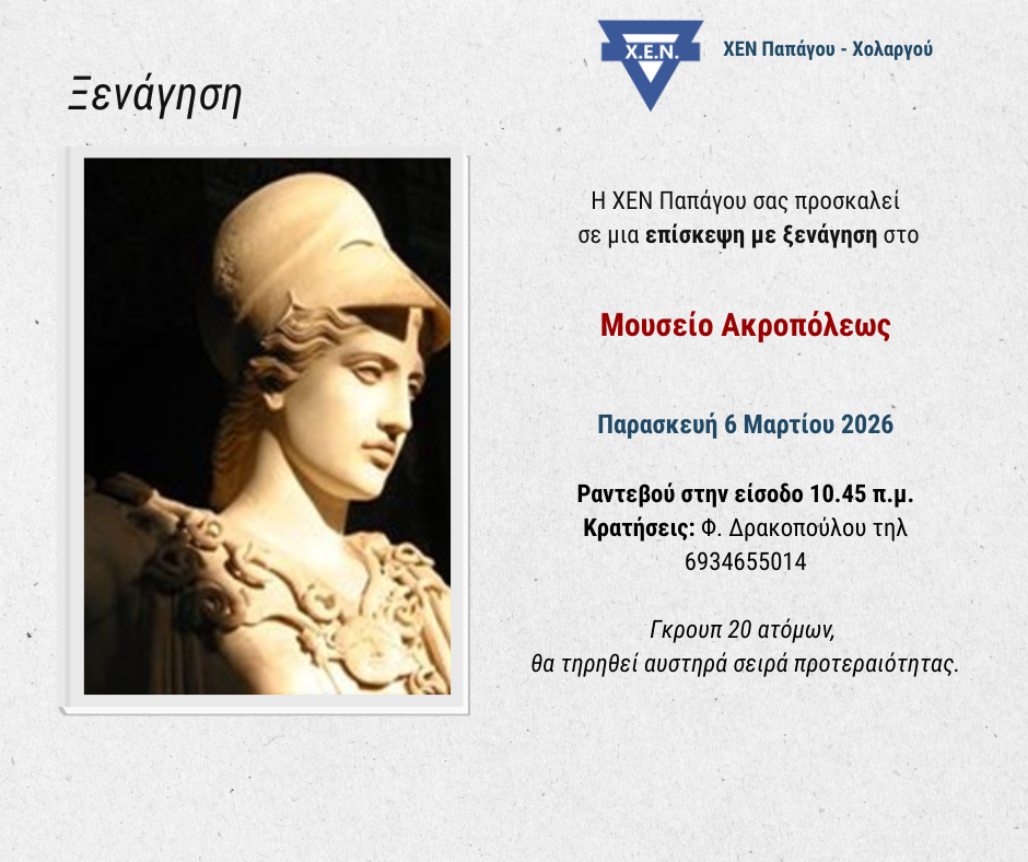 Ξενάγηση 06 Μαρτίου 2026 - 10:45 Μουσείο Ακρόπολης Συμμετοχή ◄ Προηγούμενη Ανάρτηση Επόμενη Ανάρτηση ► Αίτηση Συμμετοχής στην Εκδήλωση : Ξενάγηση Όνομα * E-Mail * Διεύθυνση Κατοικίας Επώνυμο * Τηλέφωνα * Επάγγελμα Πρόσθετες Πληροφορίες Εγγραφή στο ενημερωτικό δελτίο της ΧΕΝ Αθηνών Τα στοιχεία που μας παραχωρείτε αποτελούν προσωπικά δεδομένα και τα διαχειριζόμαστε σύμφωνα με τις διατάξεις του Γενικού Κανονισμού Προστασίας Δεδομένων Προσωπικού Χαρακτήρα (GDPR, EE 2016/679) και του Ν.2472/1997 όπως έχει τροποποιηθεί από το Ν.3471/2006 και ισχύει σήμερα. Συνεπώς, δεν πρόκειται να αποκαλυφθούν σε τρίτους ή να χρησιμοποιηθούν για άλλο σκοπό, πέρα από την επικοινωνία και την ενημέρωσή σας σχετικά με τις δράσεις της Χ.Ε.Ν Αθηνών. Αποστολή
